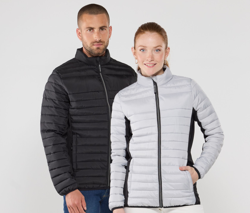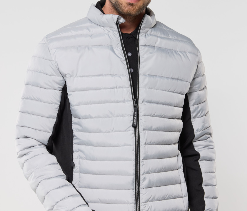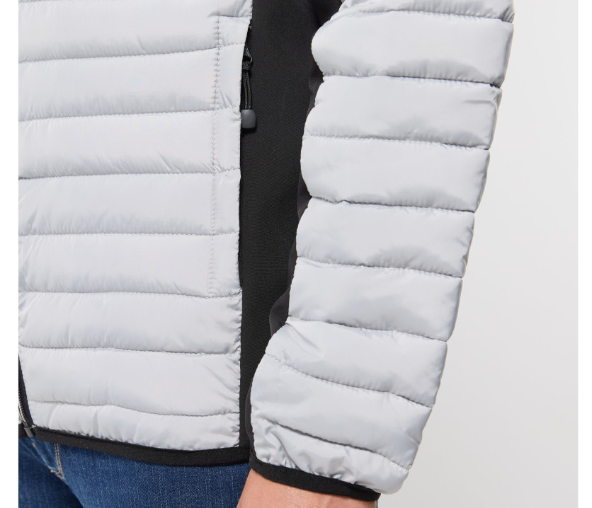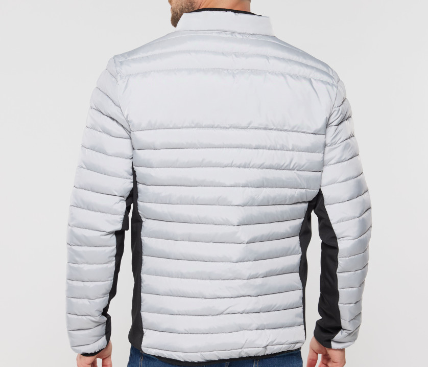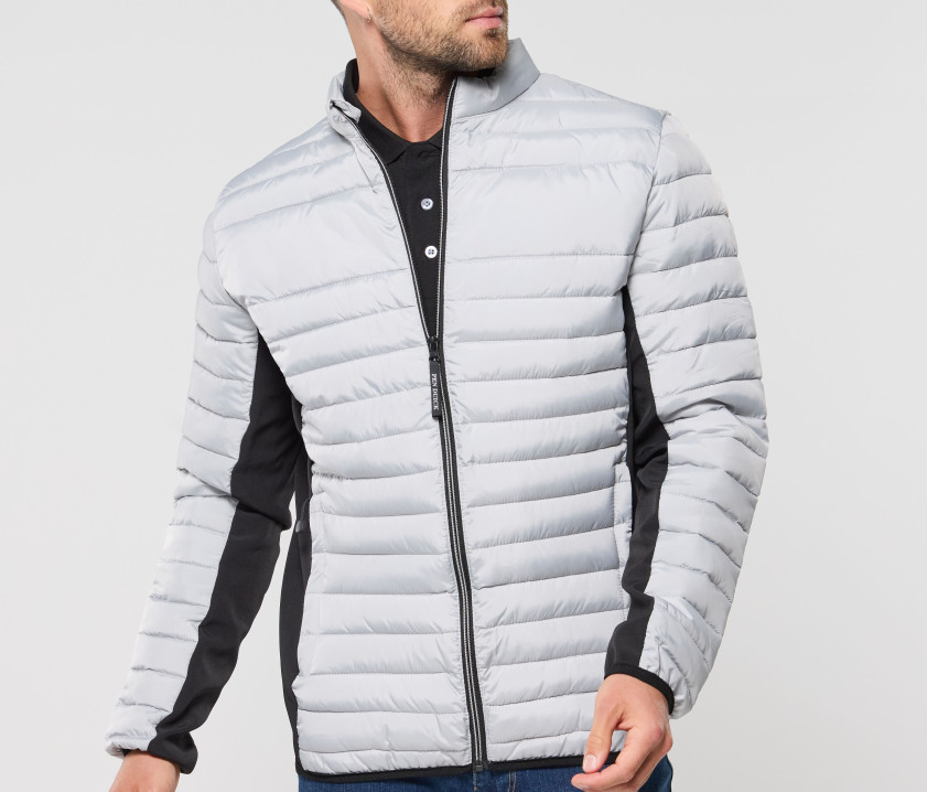 Doudoune légère moderne bi-matière, coupe ajustée. 2 poches latérales zippées. 2 poches intérieures. Protège menton. Zips contrastés. Dimension zone de marquage avant 9cm et 12cm à l’arrière.