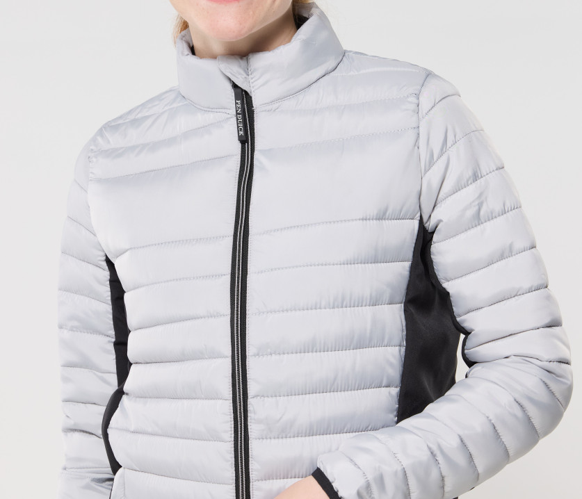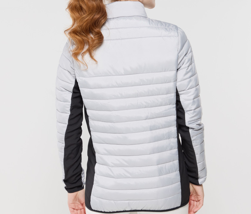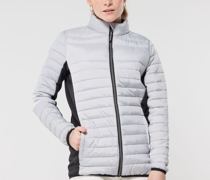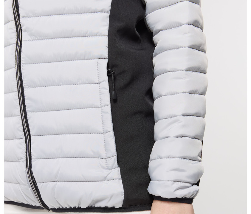 Doudoune légère moderne bi-matière, coupe ajustée. 2 poches latérales zippées. 2 poches intérieures. Protège menton. Zips contrastés. Dimension zone de marquage avant 9cm et 12cm à l’arrière.