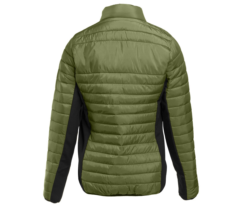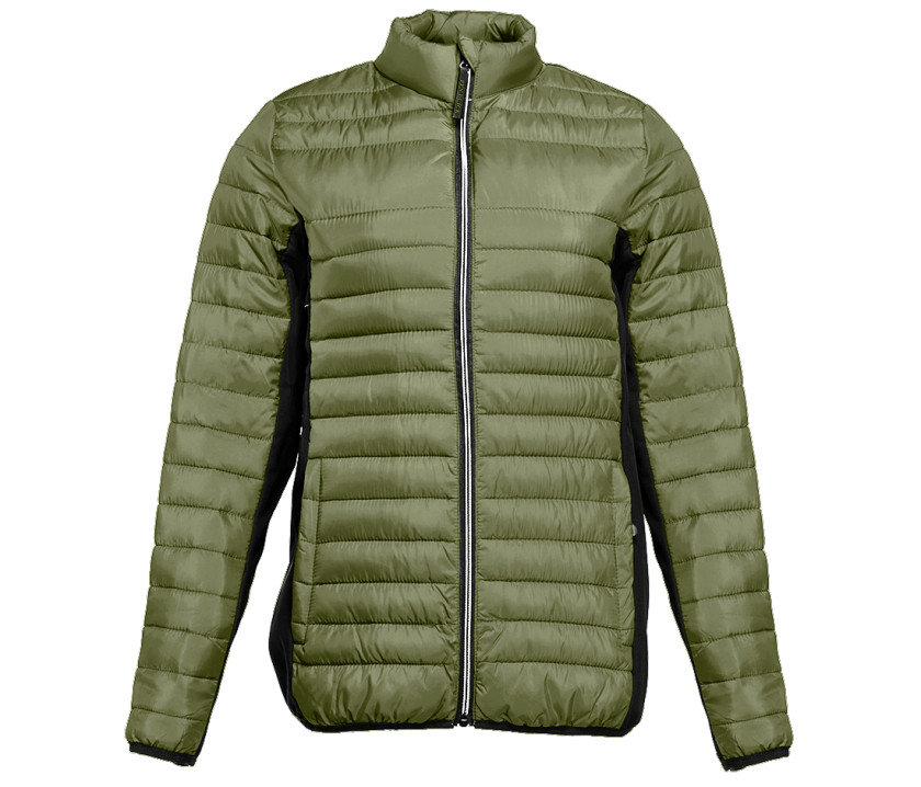 Doudoune légère moderne bi-matière, coupe ajustée. 2 poches latérales zippées. 2 poches intérieures. Protège menton. Zips contrastés. Dimension zone de marquage avant 9cm et 12cm à l’arrière.