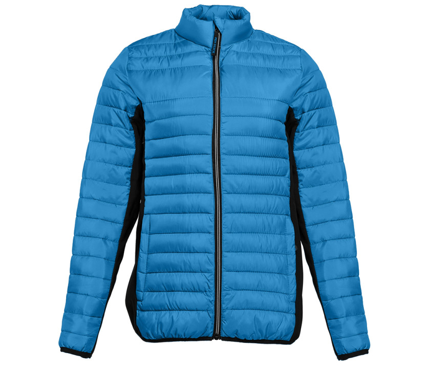 Doudoune légère moderne bi-matière, coupe ajustée. 2 poches latérales zippées. 2 poches intérieures. Protège menton. Zips contrastés. Dimension zone de marquage avant 9cm et 12cm à l’arrière.
