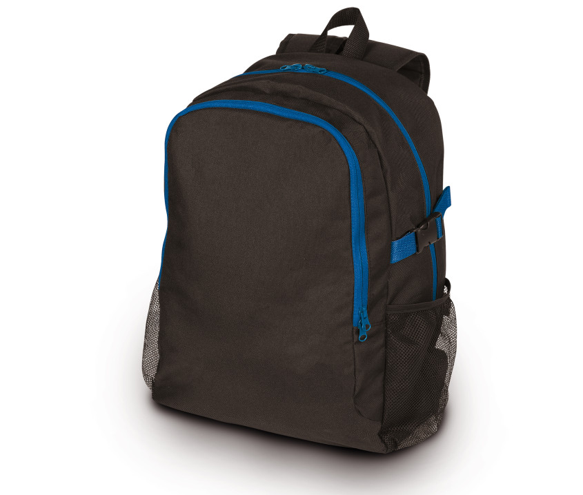 2 grands compartiments de rangement. 2 poches filet latérales. Zips inversés contrastés. Sangles de serrage sur les côtés. Surface d'impression : 15x32cm.