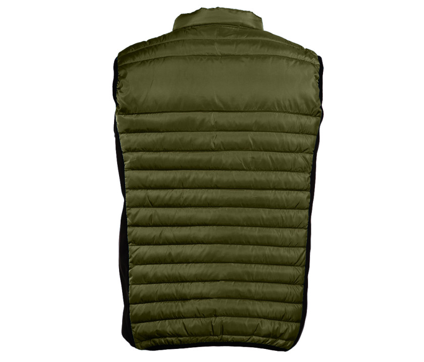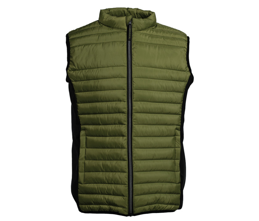 Bodywarmer léger moderne bi-matière. 2 poches latérales zippées. Protège-menton. Zips contrastés. Dimension zone de marquage avant 9cm et 12cm à l’arrière.