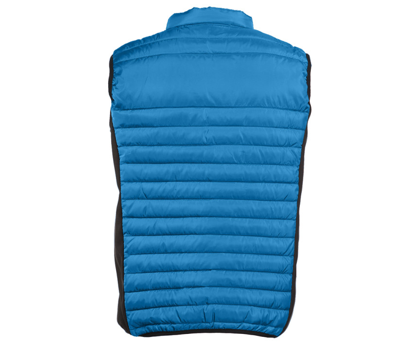 Bodywarmer léger moderne bi-matière. 2 poches latérales zippées. Protège-menton. Zips contrastés. Dimension zone de marquage avant 9cm et 12cm à l’arrière.