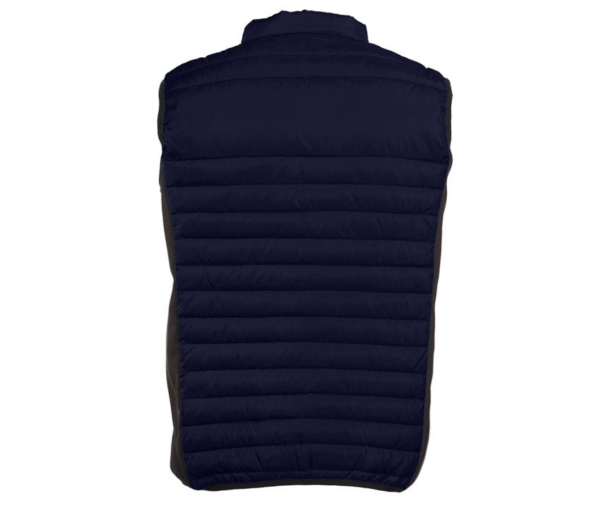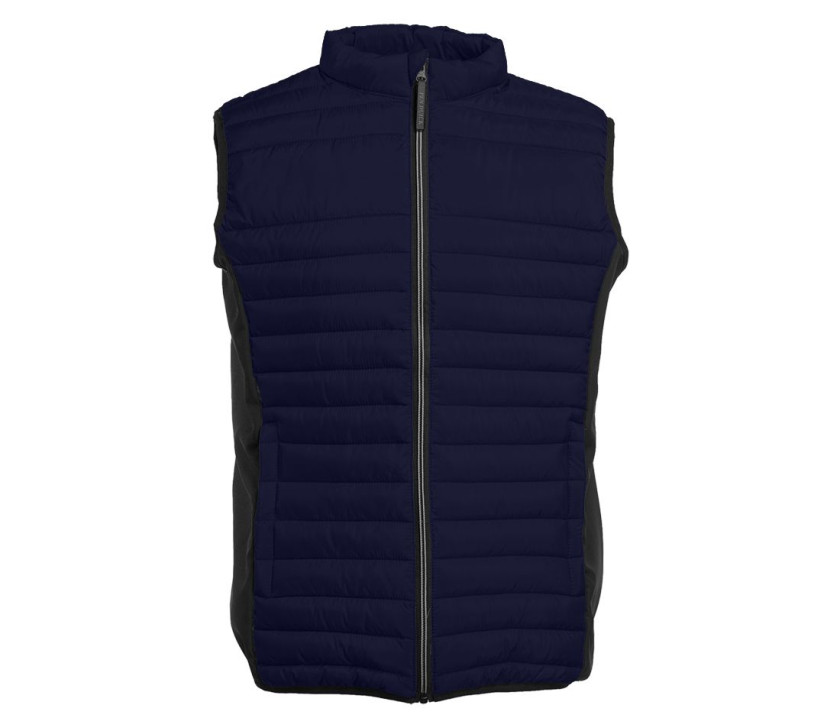 Bodywarmer léger moderne bi-matière. 2 poches latérales zippées. Protège-menton. Zips contrastés. Dimension zone de marquage avant 9cm et 12cm à l’arrière.