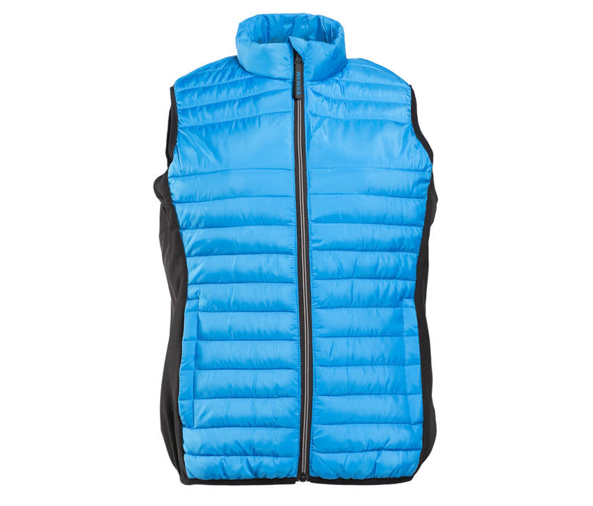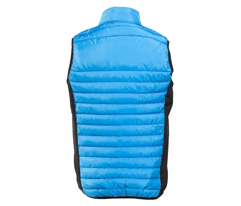 Bodywarmer léger moderne bi-matière. 2 poches latérales zippées. Protège-menton. Zips contrastés. Dimension zone de marquage avant 9cm et 12cm à l’arrière.