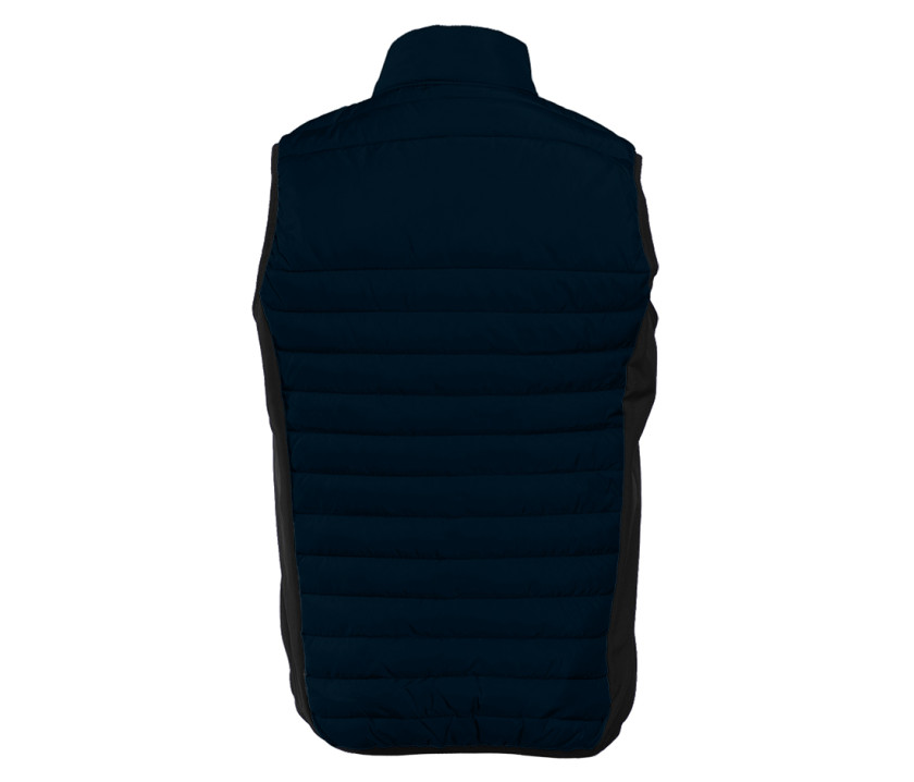 Bodywarmer léger moderne bi-matière. 2 poches latérales zippées. Protège-menton. Zips contrastés. Dimension zone de marquage avant 9cm et 12cm à l’arrière.