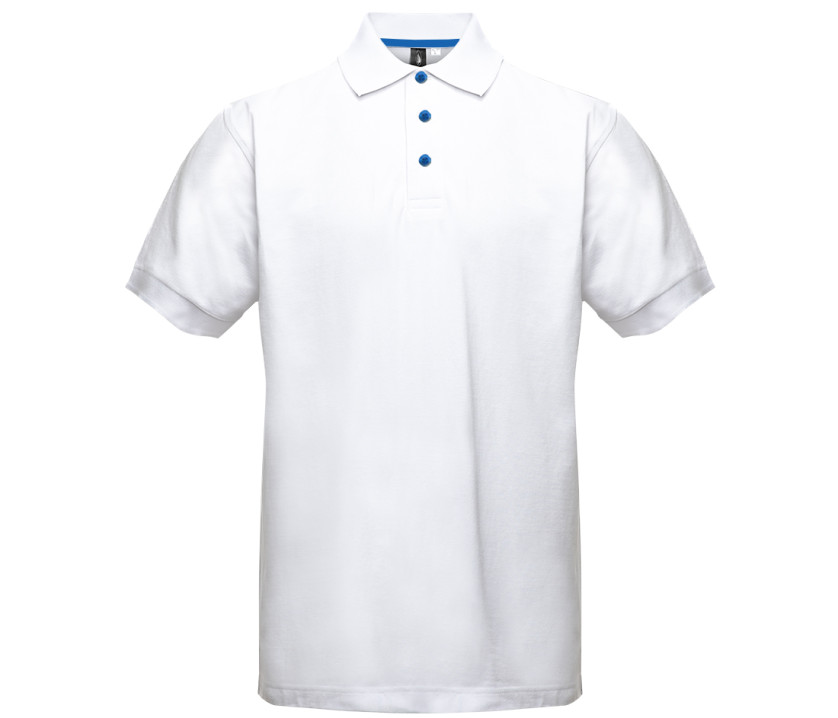 - Bande de propreté contrastée au col. Bord côte aux manches et col. Plaquette 3 boutons.