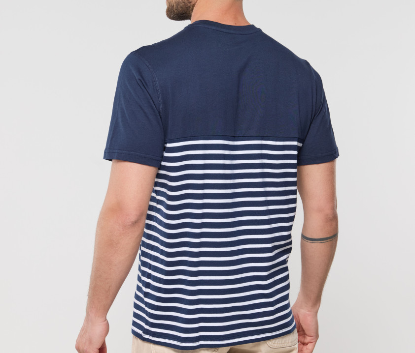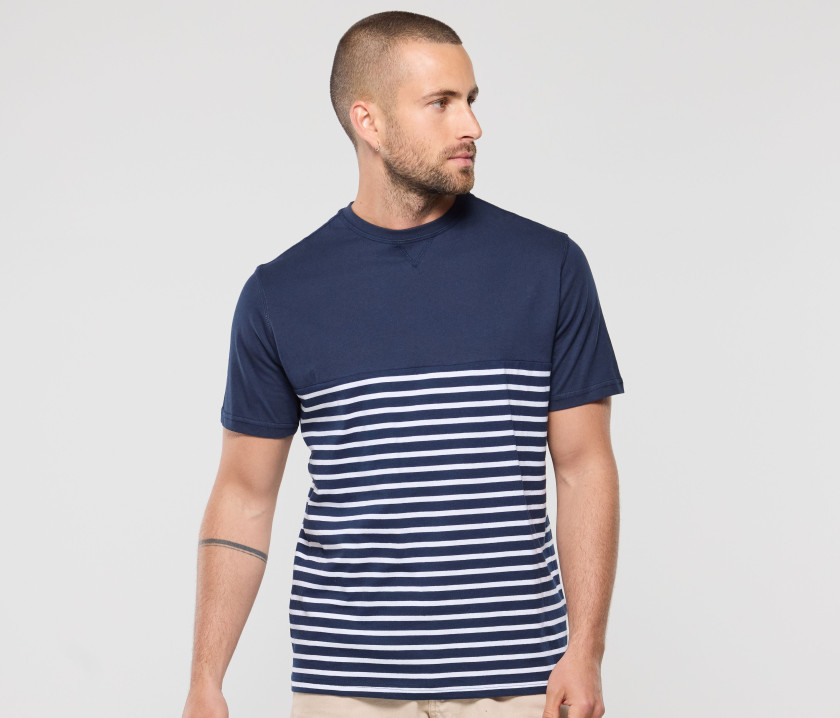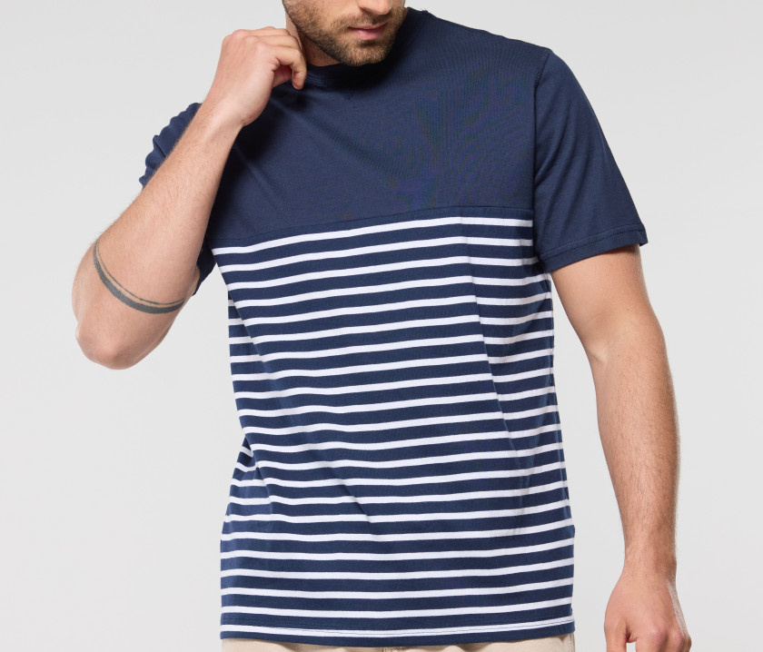 Manches courtes et droites. Rayures commençant à 20 cm du col. Col avec élasthanne. Coutures latérales. Coutures en croix sous le col.