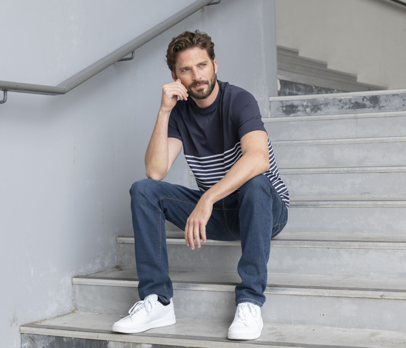- Manches courtes et droites. Rayures commençant à 20 cm du col. Col avec élasthanne.