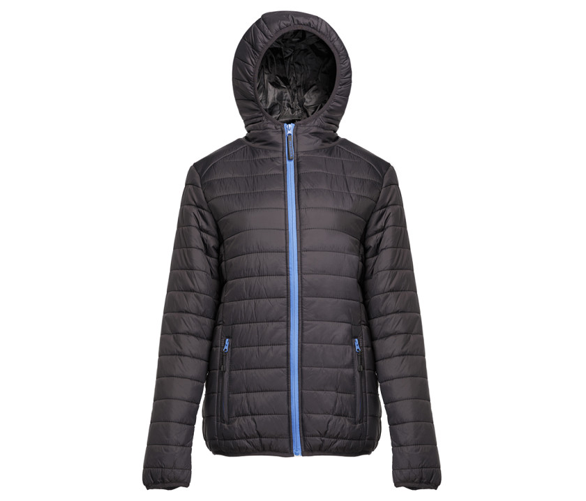 Doudoune avec capuche. Coupe-vent et déperlant. 2 poches latérales avec languette. Grande poche intérieure zippée. Poche intérieure Velcro®. Poignets et ourlet élastiqués. Hauteur entre les coutures : 4cm.