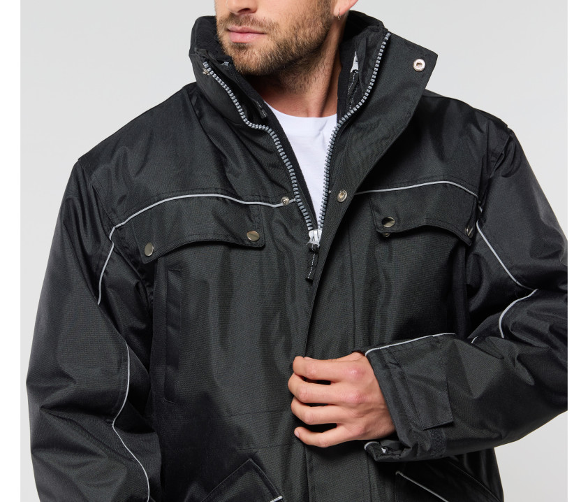 Veste de travail 3 en 1. Coupe-vent et imperméable. Passepoil réfléchissant sur le devant et le dos des manches. Patte auto-agrippante aux manches. Capuche passe-montagne dans le col. Col doublé polaire. 6 poches (4 poches poitrine (dont 2 avec boutons pression), 2 poches extérieures zippées avec tirette). Veste intérieure demi-saison. Bords côte aux manches. 2 poches latérales zippées, 3 poches intérieures dont 1 grande (18x23cm), et 1 poche poitrine intérieure zippée.