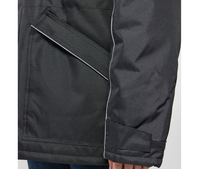 - Veste de travail 3 en 1. Coupe-vent et imperméable. Passepoil réfléchissant sur le devant et le dos des manches. Capuche passe-montagne dans le col.
