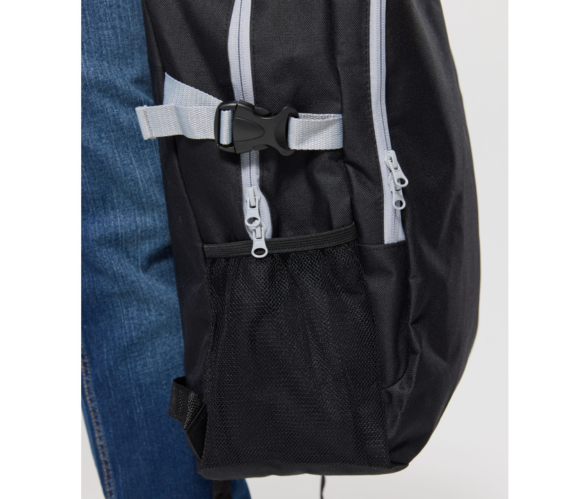 2 grands compartiments de rangement. 2 poches filet latérales. Zips inversés contrastés. Sangles de serrage sur les côtés. Surface d'impression : 15x32cm.
