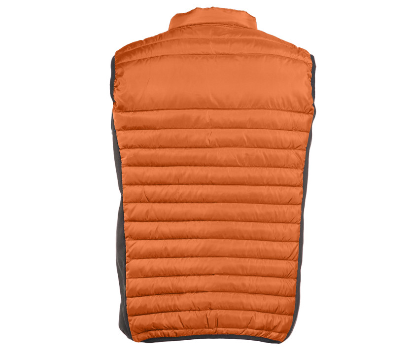 Bodywarmer léger moderne bi-matière. 2 poches latérales zippées. Protège-menton. Zips contrastés. Dimension zone de marquage avant 9cm et 12cm à l’arrière.