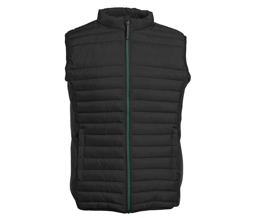 Bodywarmer léger moderne bi-matière. 2 poches latérales zippées. Protège-menton. Zips contrastés. Dimension zone de marquage avant 9cm et 12cm à l’arrière.