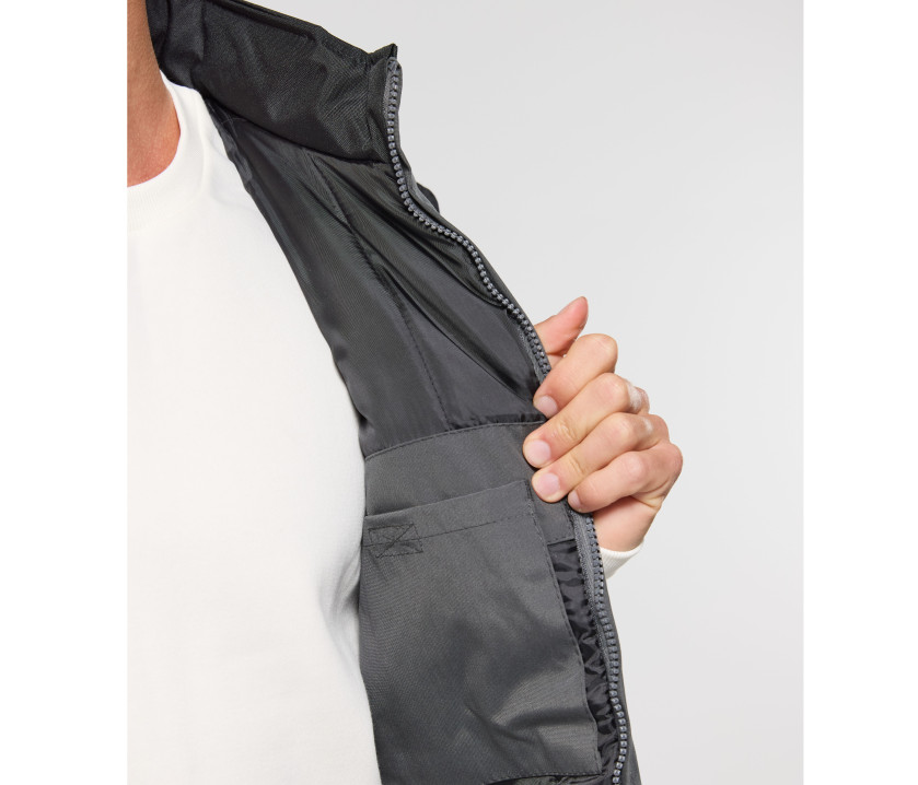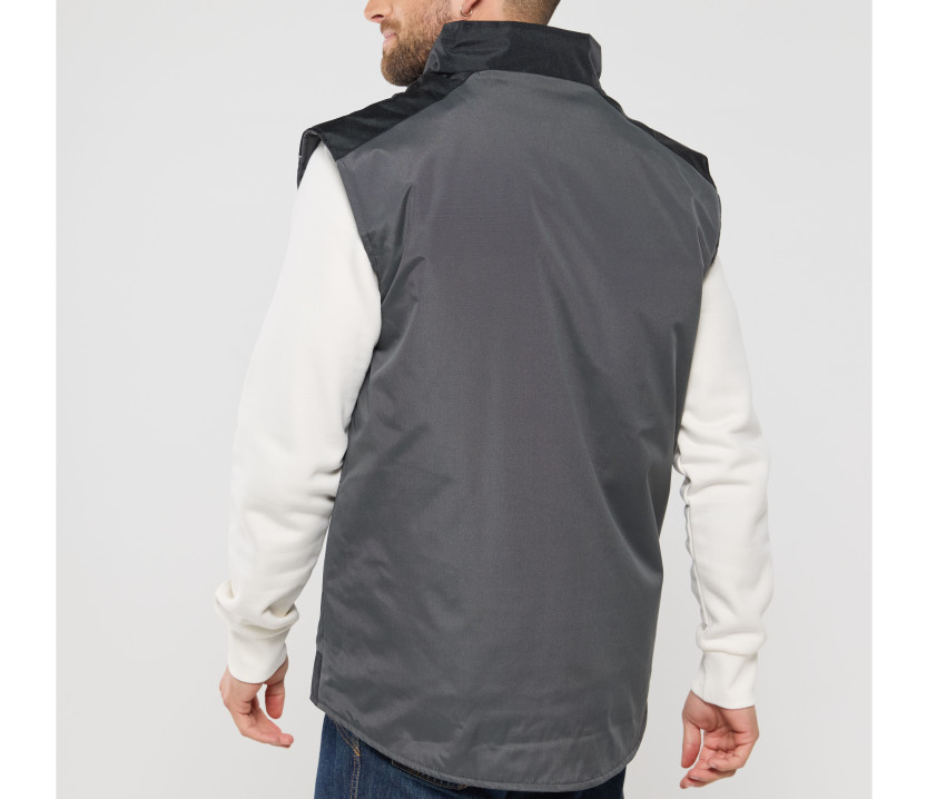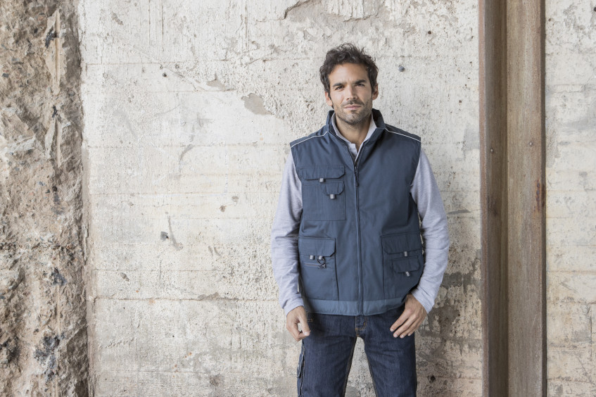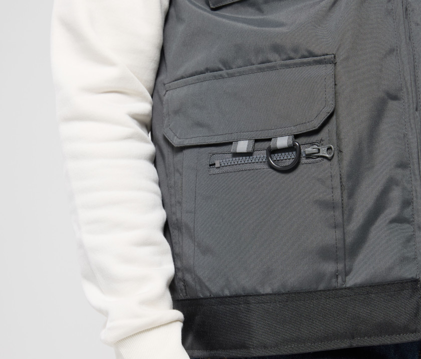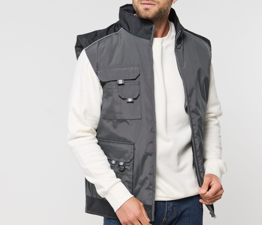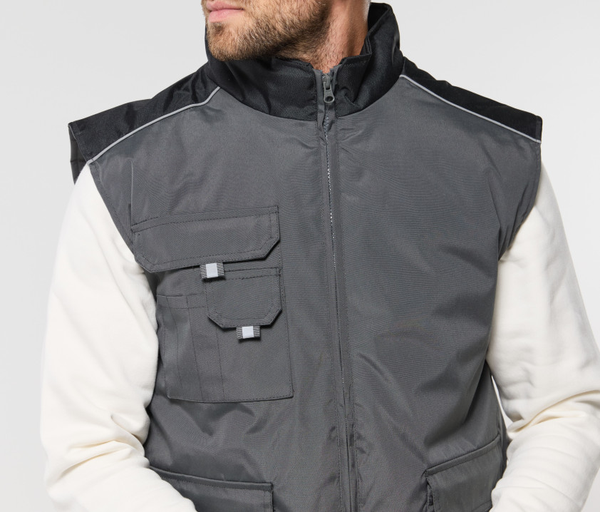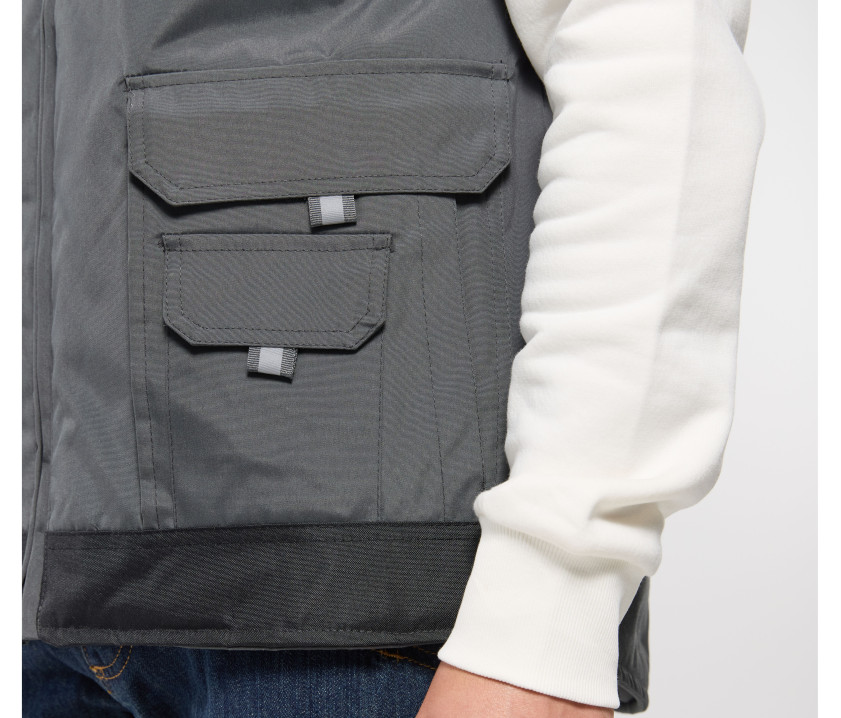 Empiècement épaules, col et partie basse avant en oxford 330D. Coupe-vent et imperméable. 11 poches extérieures (1 poche zippée devant, 4 poches Velcro®, 2 poches latérales, 3 poches stylos, 1 poche téléphone). Bandes réfléchissantes épaules et poches. Accès personnalisation. Existe en blouson Réf. PK542 page 286.