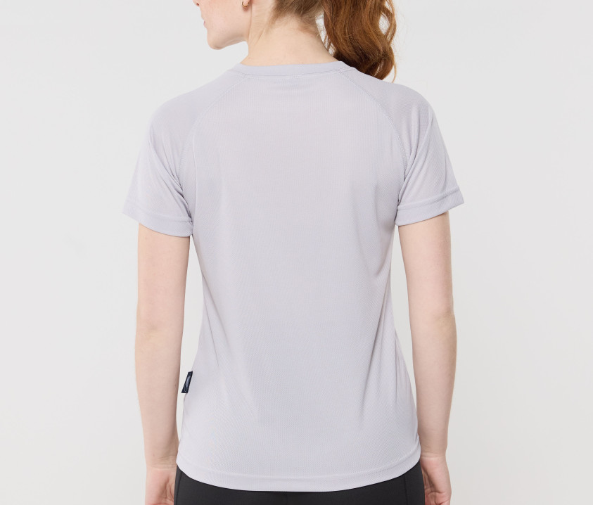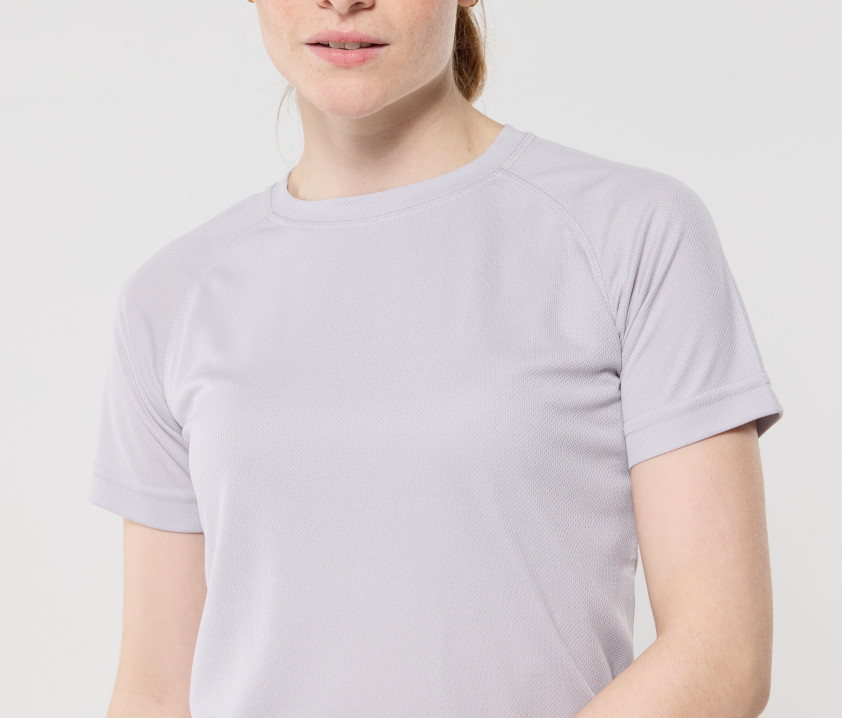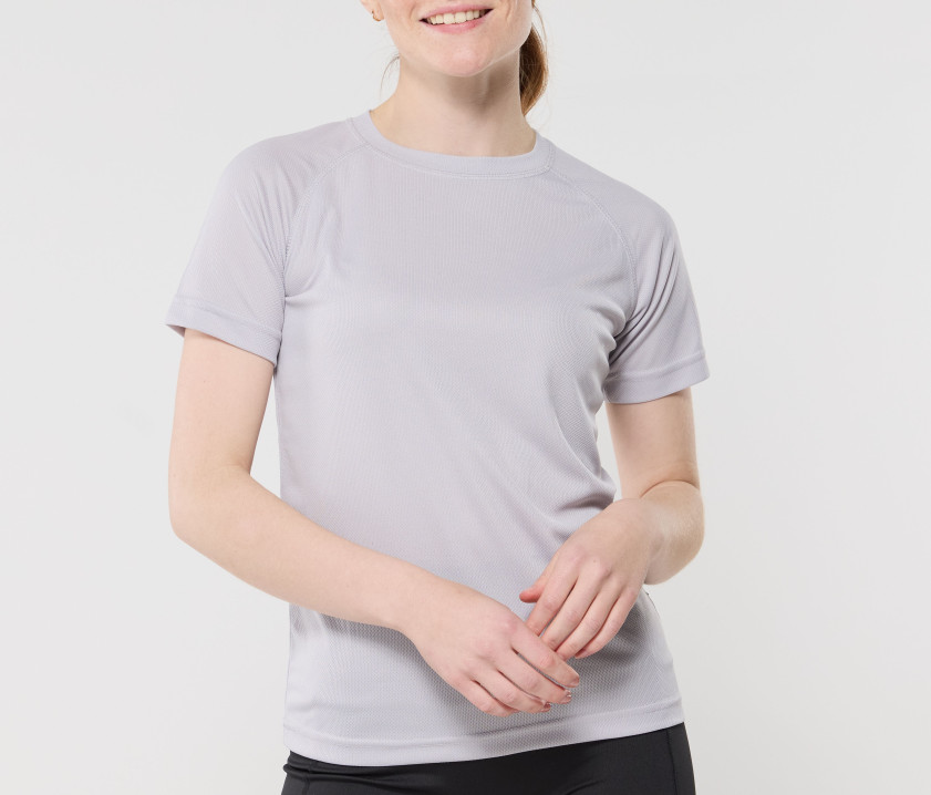 - Tee-shirt femme en 100% polyester à séchage rapide. Coupe ajustée. Manches raglan.