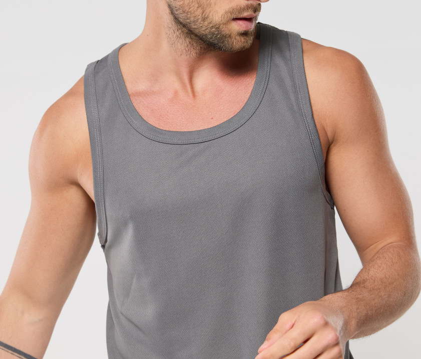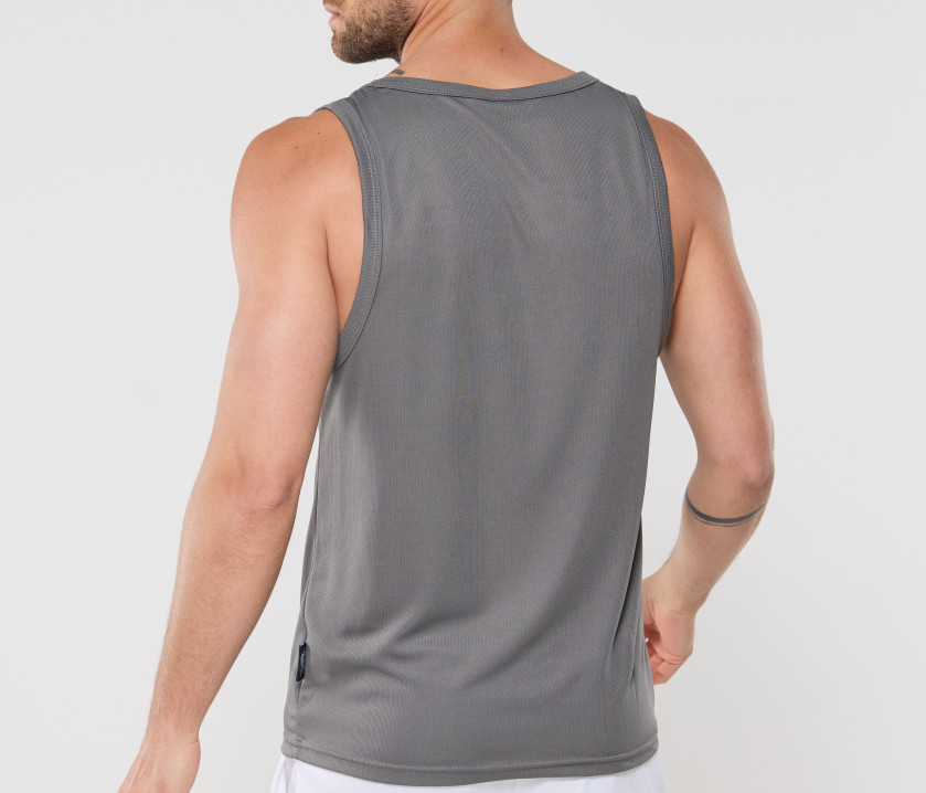 Débardeur de sport homme. Étiquette imprimée pour plus de confort. Léger et respirant. Coupe sportive. Col et emmanchures de la même matière que le débardeur. Disponible en 9 couleurs.