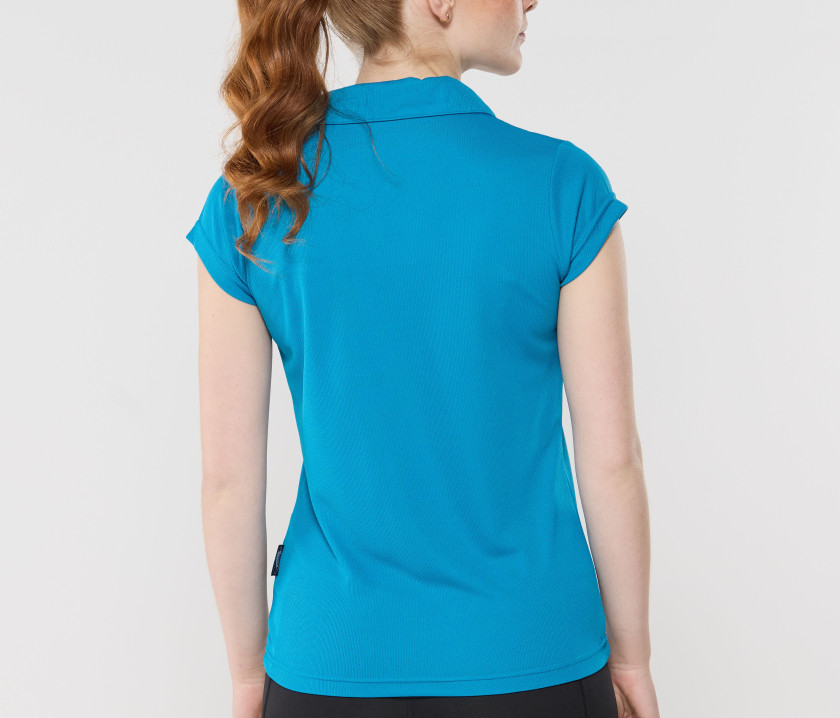 Manches américaines. Col de la même matière que le polo. Étiquette imprimée pour plus de confort. Double surpiqûre aux manches et à l'ourlet. Col en V sans bouton.