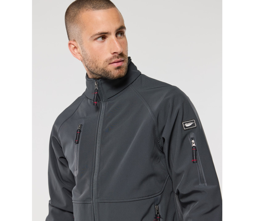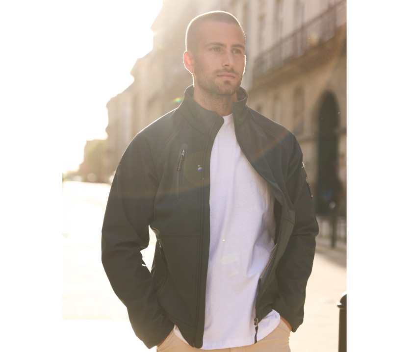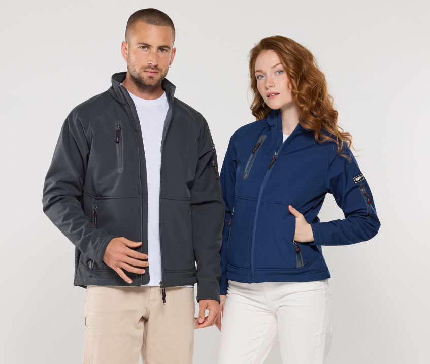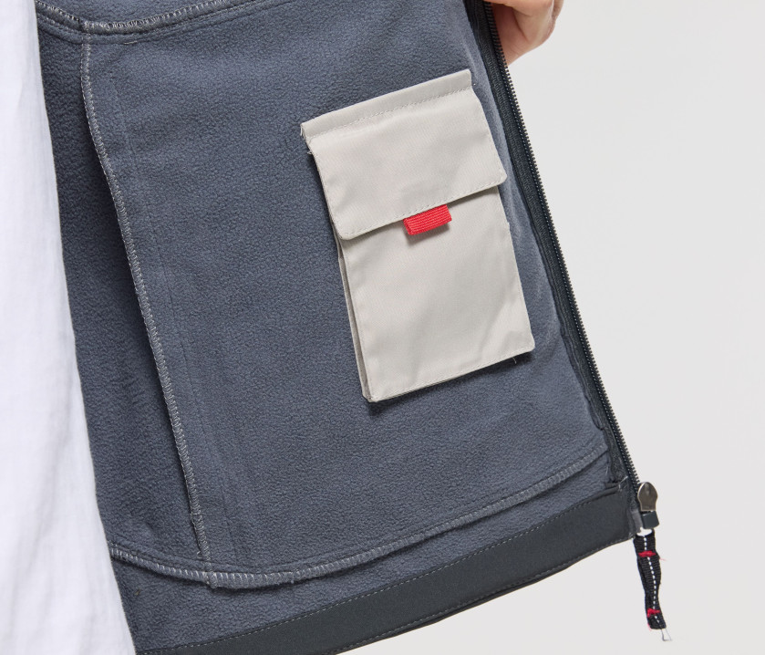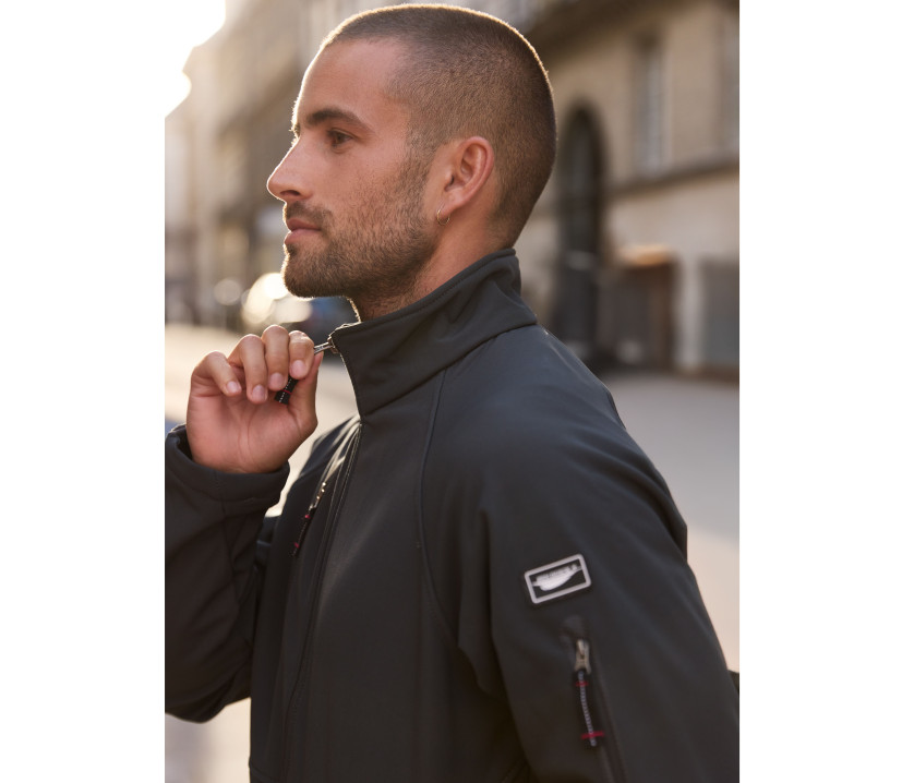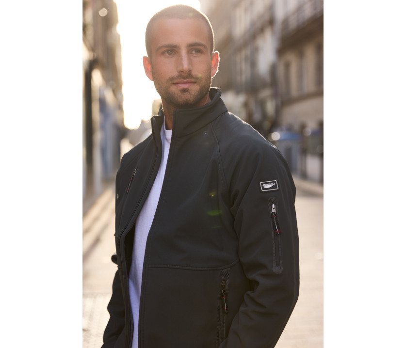 Blouson Softshell ultra léger. Tissu contrecollé 3 couches avec membrane respirante (800g) et imperméable (3000-5000mm). Intérieur en micropolaire. 3 poches extérieures zippées. Élastique bas avec stopper. Coupe ajustée. 1 poche zippée sur la manche. Modèle bodywarmer PK765 page 187.